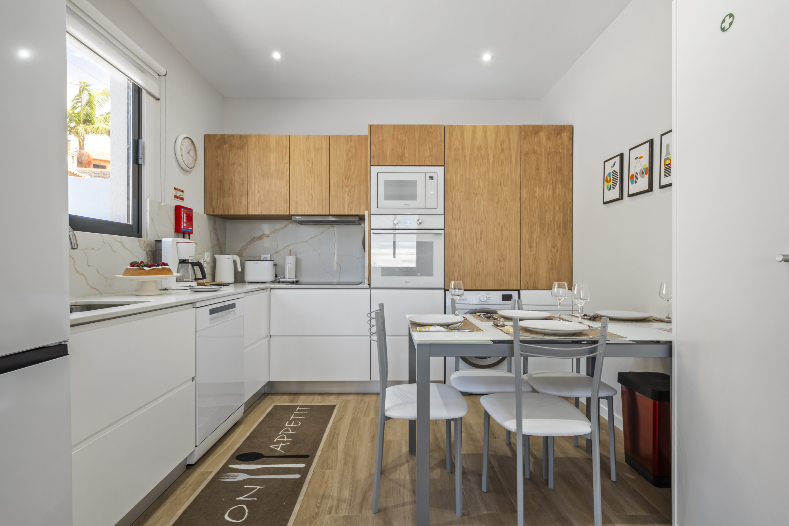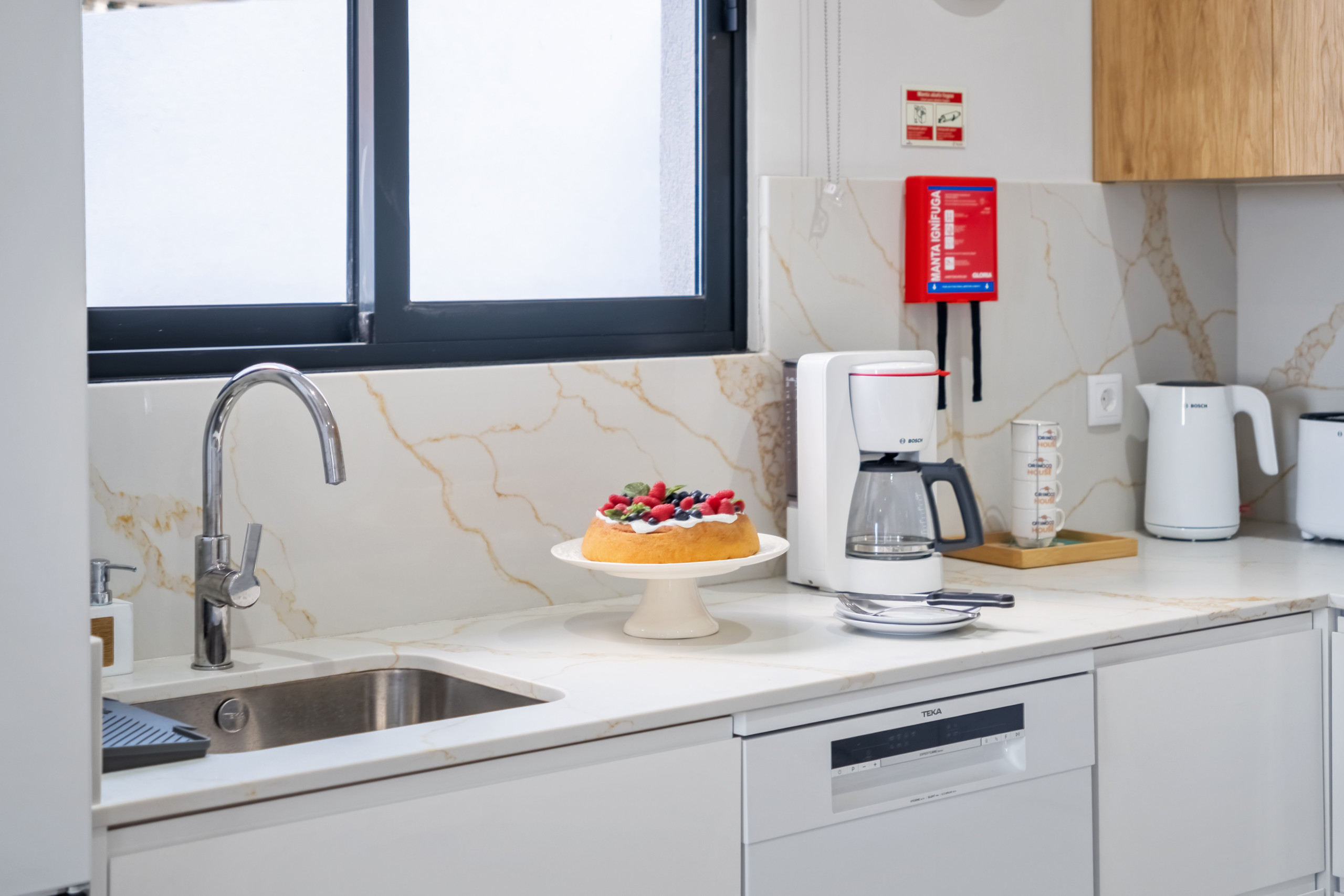 A cozinha, está equipada com frigorífico, microondas, forno, congelador, máquina de lavar louça, louça/talheres, utensílios/cozinha, máquina de café, torradeira e jarro eléctrico.